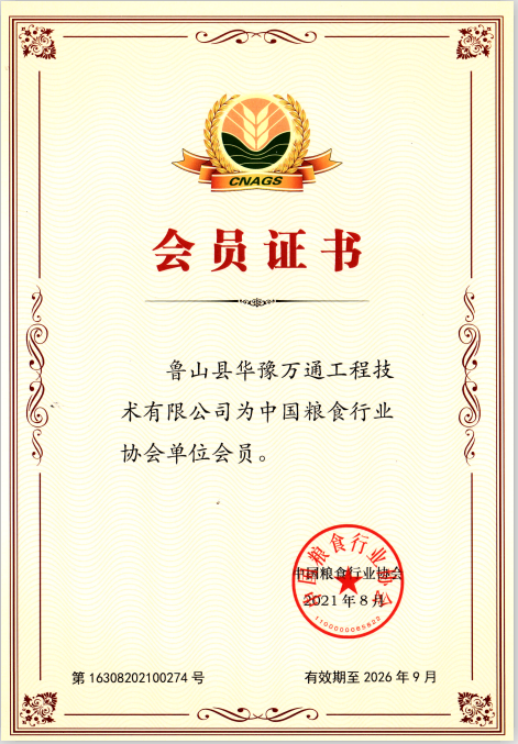 2021年8月,中国粮食行业协会多方位考察,授予鲁山县AG百家乐工程技术有限公司评会员单位称号,并颁发会员单位证书